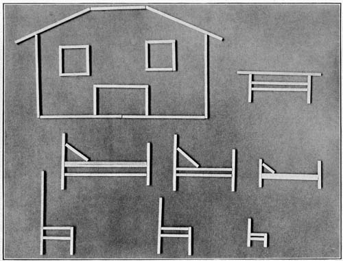 If you want to make stick pictures in the house on a stormy day, ask mother to let you use her sewing table to put them on, or you can lay them on the kitchen floor, or the nursery hearth rug. For the indoor stick pictures, you can use burnt matches, or toothpicks, or clothes pins—anything long and straight will do. You can buy colored sticks at a kindergarten shop, and those will be the best of all for stick pictures. And if you have a game of jackstraws, the straws may be used for the pictures.