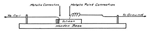 Next comes a “detector.” This consists of a wooden base about six inches long by four wide and an inch thick, on which is mounted a piece of silicon about the size of an egg. An insulated wire passed once around the silicon and then through two holes in the base will hold the silicon in position in the center of the block. Put a brass screw an inch long at each end of the block and[184] “connect up” the silicon in the following way: First take a piece of No. 22 single-covered copper wire, scrape off a few inches of the covering, and wind this bare copper wire several times around a small round stick to form a spring. The bare end of the spring must be filed to a point and rest against one end of the silicon, while the other end of the wire is wound around one of the brass screws. Next, take a piece of ordinary insulated telephone wire, bare one end far enough to wind firmly around the free end of the piece of silicon, and then wind the other end of this wire around the second brass screw. This makes a metallic circuit through the silicon which will “make” or “break” with the touching or removing of the spring.