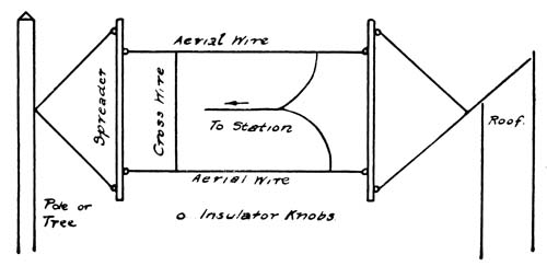 This completes the separate parts of the receiving apparatus. To connect it up for use, follow the circuit diagram. One wire from the aërial leads through the safety switch to the tuning coil. From the tuning coil carry an insulated wire to the detector, and from the detector to the ground. The receiver has two wires leading from it—one to a point between the detector and the tuning coil,[189] and the other to a similar point between the detector and the ground. When not in use the aërial should be connected directly with the ground by means of the safety switch. Where two wires are connected they must of course have the insulation scraped off so that bare wire rests against bare wire.