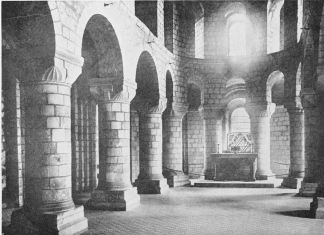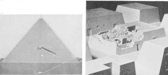 The most interesting examples of primitive structure are the so-called Cromlechs, of which that of Stonehenge, in England, is the best preserved. The unit of this and like remains is the “post and beam” formation, composed of a block of stone, supported on two uprights. In the case of Stonehenge this formation was repeated so as to form a continuous circle one hundred feet in diameter. Within this was a concentric circle, composed of smaller slabs, which enclosed a series of five separate post and beam structures on a horse-shoe plan. The latter is repeated by another series of slabs and in the centre stands the flat altar stone. Seventeen stones of the outer circle, varying from sixteen to eighteen feet in height, are still standing and in part connected by their beam slabs.