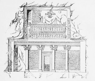 Meanwhile, an intermediary stage between the highly developed pyramids and the primitive dolmen is represented in the Altun-Obu Sepulchre, near Kertsch in the Crimea. Here the mound is faced with layers of shaped stones, with which also the chamber and the passage leading to it are lined. The ceilings of both are constructed of courses of stone, each of which projects a little beyond the one beneath it, until the diminishing space is capped by a single stone. In the angle of masonry thus formed is discoverable the rudimentary beginning of the arch.