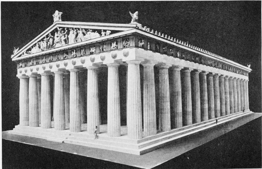 The efforts of primitive builders, it is true, are rather of archæological than of architectural significance, yet they have this much to do with architecture, that in them are to be discovered the rudiments of the art. For by the time that man had superimposed a stone horizontally upon two vertical ones, he had hit upon the principle of construction, now variously styled “post and lintel” or “post and beam” or “trabeated,” that is to say, “beam” construction. The embryo was conceived that in the fulness of time would be developed into the trabeated design of the Egyptian temple and the column-and-entablature design of Classic architecture. From the colossal, monolithic form, still preserved, for example, in Stonehenge, there is a direct progression to the highly organised perfection of the Parthenon.{9}