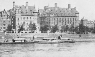 The earliest examples of domestic buildings are the lake-dwellings which have been discovered at the bottom of some of the Swiss lakes, as well as in other countries both in the Eastern and Western hemispheres. They consist of huts, rudely constructed of timber, erected on piles, sometimes in such numbers as to form a fair-sized village. Their purpose was apparently to afford security against sudden attacks of enemies, the danger of wild beasts and snakes and the malaria and fever of the swampy shores, while bringing the inhabitants nearer to their food supply and offering a crude but ready means of sanitation. The system still survives among the natives of many tropical countries and has its analogy in the boat-houses that throng the Canton River in China.