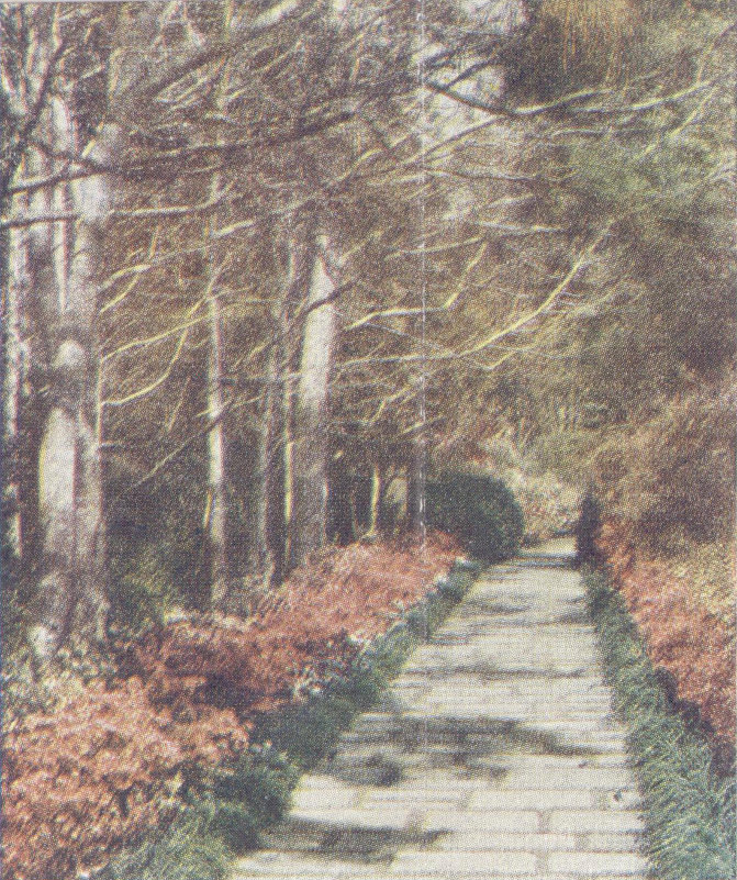 Quaint flagstone walks lead down to the rippling river—or off again to loiter by the lake to watch the gliding swans along the lily pads, or see the thousand yellow lilies dancing in reflection on the water’s edge. The tinkled splash of fountained waters or the trilling tributes of a wild bird accent the thrilling majesty that comes with peace and beauty.