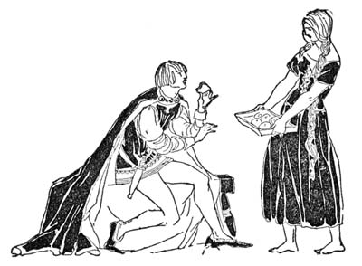 He arrived in the nick of time, for the messengers were returning almost empty-handed from the pastry-cooks’ shops. They had made[117] very little pastry that day because they knew that every one would be at the banquet and that they would have no sale for their wares.