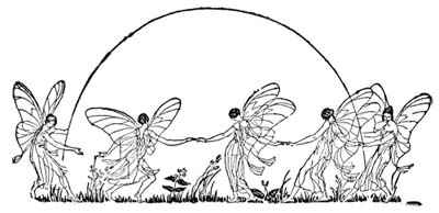 [100]All the fairies admired him very much. They thought his coat so beautifully white and soft, they loved his little black nose and quaint woodeny legs. He gave them all rides on his back in turn (even the Fairy Queen had one), and when the time for dancing came he did very well indeed and astonished them all with his pretty steps. When he left, the Fairy Queen presented him with a garland of daisies. “They are fairy flowers,” she said. “They will never fade, and so long as you wear them you will remain young.”