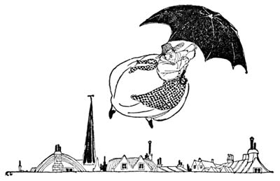 By this time the sun had come out, and as she was much taken up with wondering how she was going to keep her nose warm, the farmer’s wife forgot all about the umbrella. Next day, when she went to fetch it, it was gone. I don’t know what happened to it, nor who has it now. But let me give you a word of warning. If you come across a stray umbrella, pray be careful not to do any counting while you have it open in your hand. It wouldn’t be very pleasant to find yourself suddenly hanging from the top of the nearest church steeple, now would it?
