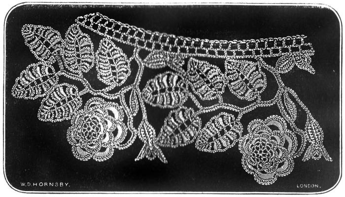 Fifth Leaf—25 chain, turn, miss 2, 3 plain, (2 chain, miss 2 and 1 treble 4 times), 2 chain, miss 2, 1 plain, turn; leaving the chain stitches for the stem, work 1 chain to cross it; then on the other side of the foundation, 7 chain, miss 1, 1 plain in the 2 chain of foundation, miss 1, 1 plain in the next 2 chain, turn back, and missing the 2 plain, work 5 treble and 1 plain in the 7 chain, turn back; 9 chain, 1 plain in the same 2 chain of the foundation as before, miss 1, 1 plain in the next 2 chain, turn back, and missing the 2 plain, work 7 treble and 1 plain in the 9 chain, turn back; then 7 chain, 1 plain in the 2 chain as before, miss 1, 1 plain, turn back; 5 treble and 1 plain in the 7 chain, turn back; 5 chain, 1 plain in the 2 chain, miss 1, 1 plain, turn back; 3 treble, and 1 plain in the 5 chain, turn back; join it to the 4th division of the 4th Leaf; 2 chain, miss 1, 3 treble on the 3 plain, and in the 2 chain at the point of the leaf, (work 1 plain, 2 chain, and 1 plain), turn, and work the other side to correspond, thus—3 treble, 5 chain, 1 plain in the 2 chain, miss 1, 1 plain, turn back, and missing the 2 plain, work 3 treble and 1 plain in the 5 chain, turn back; 7 chain, 1 plain, miss 1, 1 plain, turn back; work 5 treble and 1 plain in the 7 chain, turn back; 9 chain, 1 plain, miss 1, 1 plain, turn back; 7 treble, and 1 plain in the 9 chain, turn back; join on a rose at the centre stitch of the 1st 8 treble; then for the leaf, 7 chain, 1 plain, miss 1, 1 plain, turn back; 5 treble and 1 plain in the 7 chain, turn back; 5 chain, 1 plain, 5 single down the stem, and 14 plain down the centre stem; then