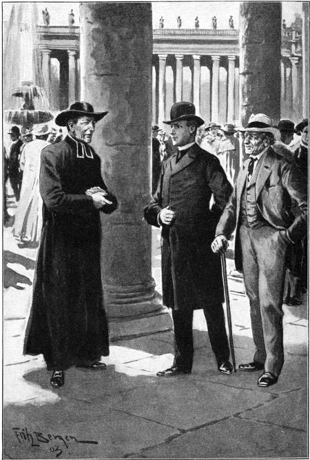 Der seltsame Mann trat zurück unter die Leute, die sich hier angesammelt, Peter aber neigte sich über den grauen Stein, der seines Vaters sterbliche Reste deckte … und man hörte einige Augenblicke nur das klangvolle Tönen der Glocken[13] und verhaltenes Schluchzen ergriffener Frauen. Dann erhob sich der junge Priester, bedeckte sein Haupt, das er entblößt hatte, mit dem Barett und sprach wieder ruhig: