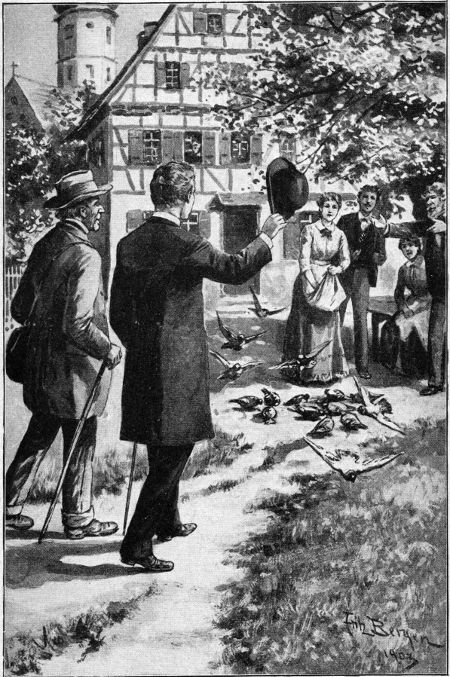 Und sie täuschten sich nicht. Ein Knabe hatte sie zurecht gewiesen, und so traten sie in den Pfarrhof ein. Hier aber war es Frohwalt, als sehe er jenes freundliche Bild in Wirklichkeit vor sich, das er in Quandts Skizzenmappe in Rom erblickt hatte. Da war das alte, breitbehäbige Haus von Holzfachwerk mit dem der Straße zugewendeten stattlichen Giebel und davor die prächtige Linde mit ihrem jungen, noch nicht voll entfalteten Grün. Auf der Holzbank darunter aber saßen der Maler mit seiner Frau und mit Hans Stahl, und sahen zu, wie ein prächtiges, blühendes Mädchen die lustig um sie flatternden Tauben fütterte.
