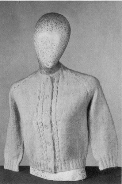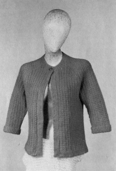 JACKET: Yoke: Beg at neck edge, with No. 10½ needles, cast on loosely 50 sts. Shape Raglan: Row 1 (wrong side): Work in ribbing of k 1, p 1 on 5 sts (center band), P to last 5 sts, work in ribbing of k 1, p 1 on last 5 sts (center band). Row 2 (right side): Yarn in back, sl 1 as if to p, (K 1, p 1) twice, k 9 for left front, yo (an inc), k 1 (seam st), mark this st and following seam sts, yo, k 2 for sleeve, yo, k 1 (seam st), yo, k 14 for back, yo, k 1 (seam st), yo, k 2 for sleeve, yo, k 1 (seam st), yo, k 9, (p 1, k 1) twice, sl 1 right front—8 increases made.