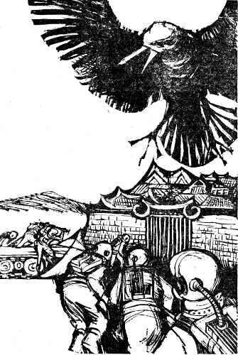 There was much to do before the scarlet bird came winging in from Jiro's shoulder with the message that the trap was sprung. At the Hour of the Monkey, four hours before the troopers were to be in ambush, the first blabrigar flew in to report to Ito-san that the boy's mount was winded, the enemy was drawing nearer the ravine, and that Jiro was approaching the point of rendezvous where he would find a fresh camelopard. Hartford ordered out two youths to join Jiro there in his harassment of the foot-soldiers from Regiment.