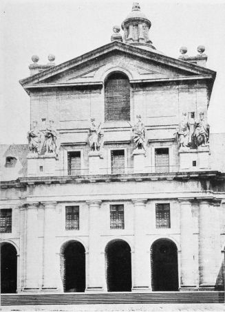 Toledo’s plan was ambitious and eccentric. He was influenced by the Renaissance ideals, and he employed the Doric style in its severest examples. Philip would have no luxurious decorations, no flamboyant effects; everything{11} must be plain to austerity. Some critics have asserted that the simplicity of the Escorial is impressive and noble, while others complain of its rigidity and sombreness. The plan of the building is in the shape of a gridiron, to commemorate, it is surmised, the fate of San Lorenzo, who was roasted on a grid. The handle of the gridiron is represented by the Palace of the Infantas; the monastery, the seminary, and the royal apartments represent the bars of the implement upon which the saint was martyred.