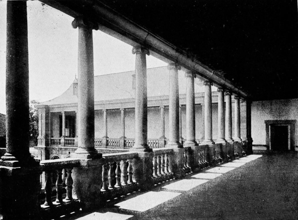 The Vestibule is about 80 feet wide, and leads into the Patio de los Reyes, or Court of the Kings. To the right of the Vestibule are the Libraries, the Refectory, and the Convent, and on the left is the College. The walls of the Patio are decorated with pilasters, and there are many fine windows to the apartments. Six statues of the Reyes de Judea stand in the Court, the work of Monegro, who used granite for the bodies and marble for the head and hands, as in the case of the effigy of San Lorenzo, above the main gateway.{25}