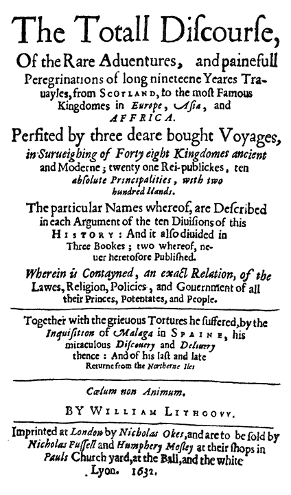 From Paris, on March 7th, 1609, Lithgow set out on the first of the three journeys of which he gives an account in his ‘Totall Discourse,’ where he claims that his ‘paynefull feet traced over (beside my passages of Seas and Rivers) thirty-six thousand and odde miles, which draweth neare to twice the circumference of the whole Earth.’