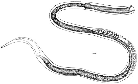 De Rondwormen (Nemathelminthes) hebben een draad- of buisvormig lichaam, dat altijd ongeleed is en nimmer ledematen heeft. De huid is taai en stevig, de onmiddellijk hiermede verbonden spierlaag dikwijls zeer ontwikkeld. Met uitzondering van enkele soorten, zijn alle Draadwormen eenslachtig. Afzonderlijke organen voor de ademhaling ontbreken. Een vaatstelsel komt nooit tot ontwikkeling; het kleurlooze bloed vult de ruimten, die in de lichaamsholte tusschen de ingewanden overblijven. De meeste Nematoden leggen eieren. Bij een groot aantal is echter de ontwikkeling van de kiem reeds in den eileider zoo ver voortgeschreden, dat het uitkomen van de jongen met het eierenleggen samenvalt en de jongen, zooals men het noemt, „levend geboren worden”.