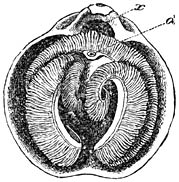 Lederachtige Zakpijp [Ascidia (Cynthia) microcosmus] opengesneden: a) kieuwopening. b) kloakopening van de mantelholte. De soortnaam („kleine wereld”) doelt op de talrijke dieren en planten, die gewoonlijk aan den mantel zijn vastgehecht. Ware grootte.—c) De kieuwopening van de mantelholte, vergroot.