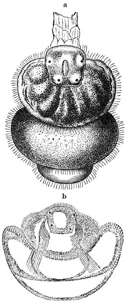 De Zakpijpen of Ascidiën zijn slechts gedurende korten tijd, als larven, van een roeistaart voorzien en dan tot vrije beweging geschikt; weldra echter hechten zij zich voor goed aan allerlei onderzeesche voorwerpen vast. In alle zeeën en op zeer verschillende diepten vindt men groote, vastzittende Ascidiën, die zelfstandig leven, (d. w. z. geen koloniën vormen). Door het beschouwen van een exemplaar van een dezer soorten, die niet zeldzaam zijn, kan men de Manteldieren het gemakkelijkst leeren kennen; een grove ontleding is, zooals hierboven bleek, voldoende. Zij worden Enkelvoudige Ascidiën (Monascidiae) genoemd, in tegenstelling met die, welke, door een gemeenschappelijken mantel omhuld, tot „stokken” vereenigd zijn. Hun dikke „schaal”, de buitenste mantel, stemt klaarblijkelijk niet met de mantellobben der Armpootigen of der Plaatkieuwige Weekdieren overeen; men kan haar hoogstens met de tweekleppige schelp van deze dieren vergelijken, hoewel het afscheidingsproduct van de huid, dat aan dit hulsel stevigheid verschaft, grootendeels koolzure kalk is en niet, zooals bij de Manteldieren, cellulose. In de schaal komen 2 openingen voor: de eene (a) voert het ademhalingswater in een wijde ruimte, die aan den „kieuwkorf” van Amphioxus herinnert, daar zij omgeven is door een wand, welks talrijke spleten een zeer regelmatig traliewerk vormen; deze wand ligt bijna tegen den binnensten mantel aan en is er door eenige draden mede verbonden. Door de hier overblijvende ruimte stroomt het water, dat voor de ademhaling dient zoolang het met de mazen van het traliewerk in aanraking is, naar de kloak die door de kloakopening (b) met de buitenwereld in gemeenschap staat. De voedseldeeltjes, die met het water naar binnen dringen, worden door de trilharen, die den wand bekleeden, naar den bodem der kieuwholte gevoerd, waar zich de mond bevindt. Het spijskanaal eindigt in het korte, buisvormige deel van de kloak, dat aan de kloakopening voorafgaat; ook de geslachtsorganen monden hierin uit. De Ascidiën zijn tweeslachtig. Het ontleedkundig onderzoek van hare met een roeistaart uitgeruste larven heeft een belangrijk feit aan ’t licht gebracht, waarop Kowalévsky in 1872 het eerst de aandacht vestigde. Tijdelijk vindt men n.l. bij haar een orgaan, dat door zijn ontwikkelingsgeschiedenis een duidelijke overeenstemming verraadt met dat, welks bezit voor een der meest kenmerkende eigenaardigheden van de hoofdafdeeling der Gewervelde Dieren wordt gehouden, n.l. met de ruggestreng (chorda dorsalis).—In den larvetoestand heeft de Ascidie de mondopening en de kloakopening dicht bij elkander geplaatst aan de buikzijde. Aan de rugzijde van het spijskanaal bevindt zich een zenuwknoop, daarboven een oog en een gehoorblaasje. Voor aan den kop staan 3 papillen, waarmede het dier zich bij ’t einde van het larveleven vasthecht.