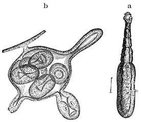 Groote Stekelsnuitworm (Echinorhynchus gigas):—a) Wijfje (ware grootte). b) Haar voorste gedeelte (vergroot).