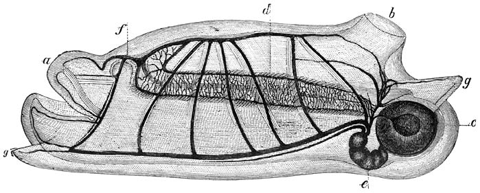 Ook bij de Salpen bestaat de lichaamsmassa grootendeels uit den mantel, die echter, ofschoon van voldoende stevigheid, zoo doorzichtig is, dat men het dier in ’t geheel niet te midden van het water zou kunnen zien, indien het zijn aanwezigheid niet verried door enkele gekleurde en ondoorzichtige lichaamsdeelen, o.a. door de tot een kluwen of kern (nucleus) vereenigde ingewanden. Men treft bij de Glaspijpen generatiewisseling aan: de geslachtsrijpe dieren zijn tot een keten vereenigd; die, welke zich ongeslachtelijk voortplanten, leven afzonderlijk. Zoowel de individuën, die tot kettingvormige reeksen verbonden [676]zijn, als die, welke afzonderlijk zwemmen, nemen, door een voorste opening (a) water op in een wijde holte, waardoor de kieuw (d) in diagonale richting is uitgespannen. Zoodra de groote slok binnen is, sluit zich de aanvoeropening; bandvormige, overlangs en dwars gerichte spieren (in de afbeelding door fijne strepen aangeduid) veroorzaken door haar gelijktijdige samentrekking het inkrimpen van het lichaam; het water ontwijkt door een opening (b) die aan ’t achtereinde, doch een weinig zijwaarts gelegen is; de hierdoor veroorzaakte schok stuwt het dier vooruit. Aan hetzelfde uiteinde van de ton ligt de bruinachtige kern, die het opgerolde spijskanaal bevat en onmiddellijk er voor, door den binnensten mantel omgeven, het buisvormige hart (e). De bloedvaten, die van het hart uitgaan, en hunne vertakkingen op de kieuw zijn in de afbeelding donkerder voorgesteld, dan men ze aan het dier met zijn waterhelder bloed kan waarnemen. Opmerkelijk is het, dat, zoowel bij de Salpen, als bij de Ascidiën het hart, nadat het een tijdlang in de eene richting het bloed heeft voortgestuwd, plotseling zijne samentrekkingen in omgekeerde volgorde doet plaats hebben en hierdoor de geheele circulatie omkeert.