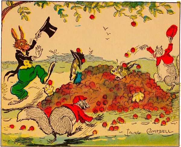7. All of a sudden, when the Bob Cat was right under big clusters of the sharp, stickery nuts, the squirrel boys began shaking down the horse chestnuts. “Bing! Bang! Bung!” they fell all over the Bob Cat, pricking him like a dozen pin cushions. “Stop! Stop! That’s enough!” howled the bad chap. But Johnnie and Billie danced the harder, sending down more prickery nuts to stick the Bob Cat. None hit the bunny.