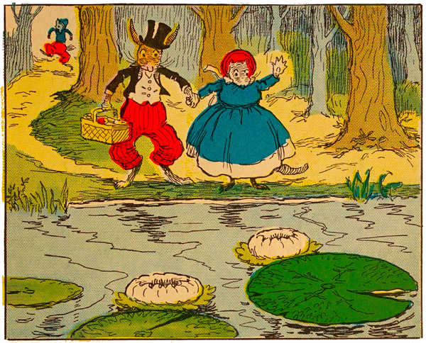 7. Suddenly, right in the path of Uncle Wiggily and Nurse Jane appeared a pond of water. “Oh, dear me! We're caught!” cried the muskrat lady. “You can’t swim, Wiggy, and we haven’t time to run around the pond. What shall we do?” Uncle Wiggily twinkled his pink nose. “We’ll wade into the pond and pretend to be water lilies. We'll come out after the Wolf passes. He’ll think we’re May blossoms.”