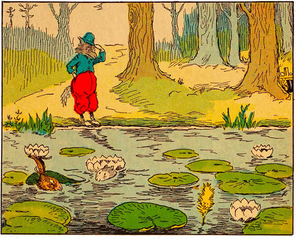 8. Uncle Wiggily and Nurse Jane waded into the pond, crouching down and hiding every bit of themselves but their faces. Their faces they held flat on the water trying to make themselves look like pond lilies. Up came the hungry Wolf. “Well, I think I had better get myself some glasses,” growled the bad chap. “I thought sure I saw Uncle Wiggily and Nurse Jane, but here are only leaves and lilies.”