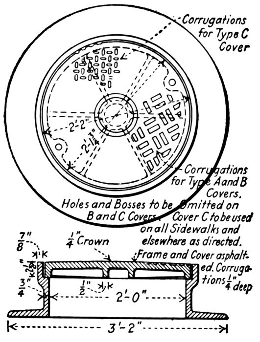 | 55. General. 56. Manholes. 57. Lampholes. 58. Street Inlets. 59. Catch-basins. 60. Grease Traps. 61. Flush-tanks. 62. Siphons. 63. Regulators. 64. Junctions. 65. Outlets. 66. Foundations. 67. Underdrains. | 99–126 |
