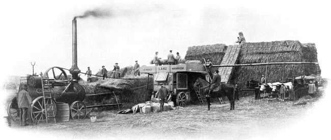 Dampfdreschmaschine mit Strohselbstbinder der Maschinenfabrik Heinrich