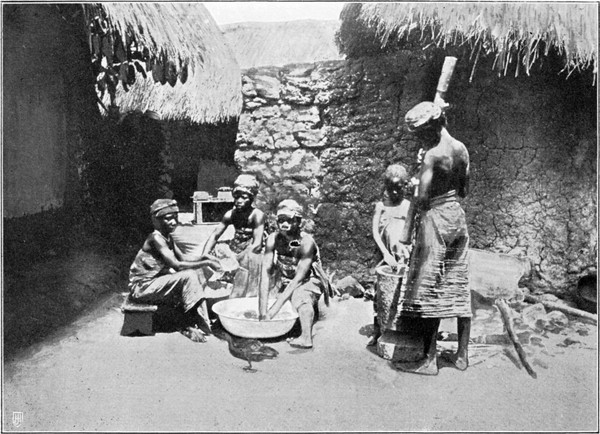 Während der Mann der Urzeit mit seinen Sippengenossen der Jagd oblag, suchte die Frau für sich und ihre Kinder, soweit sie nicht mehr von ihr gestillt wurden, was damals in Analogie mit heute noch auf derselben Kulturstufe lebenden Völkern zwei bis drei Jahre gedauert haben mag, die für sie erreichbare, hauptsächlich aus Vegetabilien und kleinen Tieren wie Würmern, Schnecken, Heuschrecken, Käfern, Raupen, Fröschen, Eidechsen, Schlangen und dergleichen bestehende Nahrung. Mit dem ziemlich langen Grabstock versehen, den sie als Universalwerkzeug und Waffe stets bei sich führte, zog sie, von ihren Kindern begleitet, in die Speise irgend welcher Art zur Stillung des stets regen Hungers versprechende Nachbarschaft des jeweiligen Lagerplatzes, um hier alle möglichen, ihr als nahrhaft bekannten Wurzeln, Früchte und Sämereien zu sammeln und zugleich alle ihr dabei entgegentretenden kleineren Tiere zu erbeuten. Was nicht sofort verzehrt wurde, wanderte als Vorrat in die mitgeführte Felltasche und später in den aus Binsen oder Bast geflochtenen Korb, um dann, roh oder[S. 2] schwach am Feuer geröstet, als Speise zu dienen. Unbeweglich, wie sie durch die Mutterschaft geworden war, zog sie notgedrungen das für sie erreichbare minderwertige Kleinere dem begehrenswerteren Größeren vor.