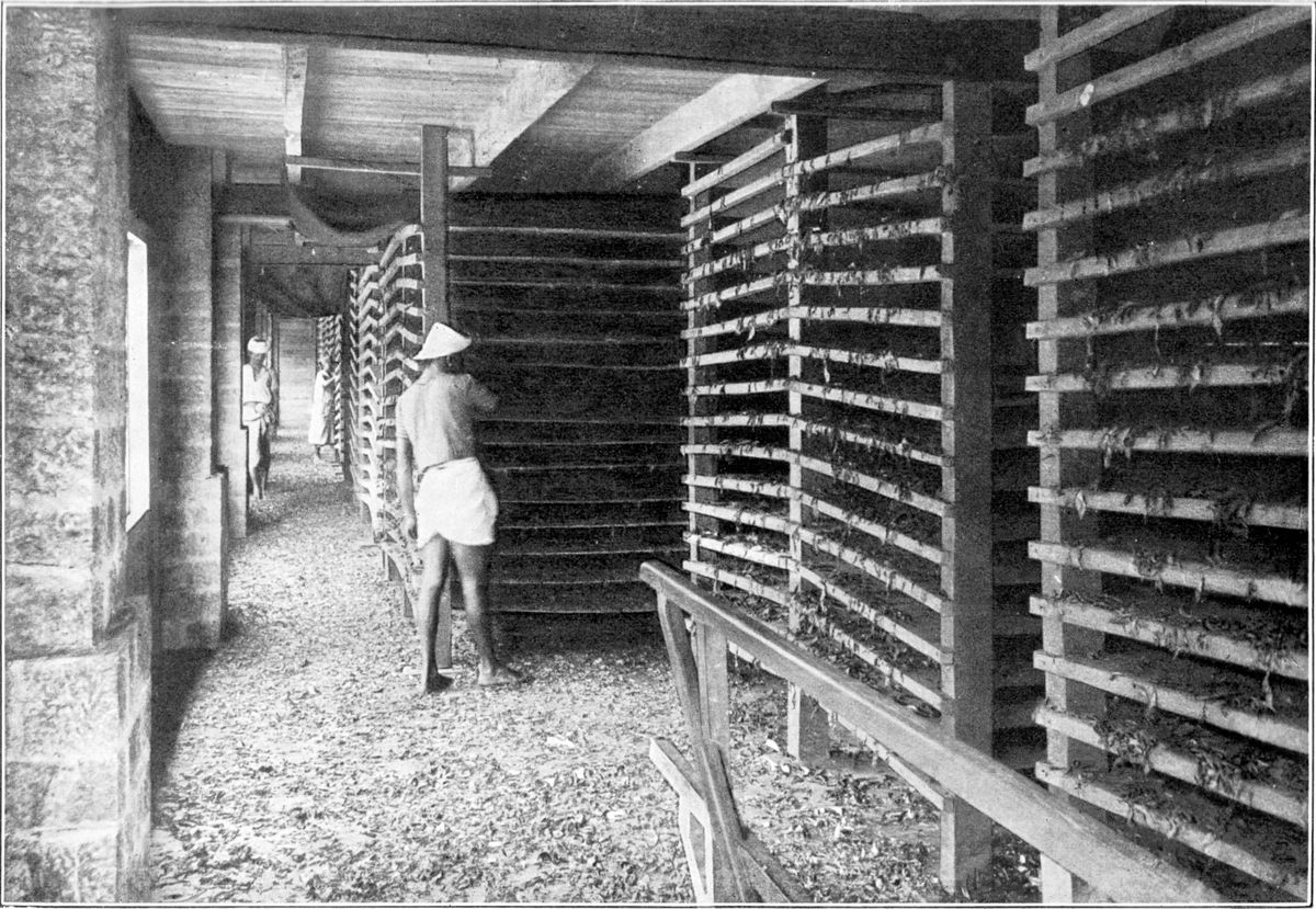 Auch die für die Veredelung des Tabaks unbedingt notwendige Fermentation der nach der Trocknung auf einen Haufen zusammengepackten Tabakblätter wird durch mehrere hintereinander arbeitende Bakterien, die man isoliert hat, bewirkt. Dabei steigt die Temperatur auf 50°C und mehr und stellt sich in einem feuchten Klima das „Schwitzen“ ein, das aber in einem trockenen unterbleibt. Dabei wird im Haufen zuerst der Sauerstoff verbraucht, es verschwinden der lösliche Zucker und einige Eiweißspaltprodukte, vor allem das Asparagin. [S. 732] Durch chemische Umsetzungen verschwindet dann bei Sauerstoffabschluß auch ein Teil — etwa 30 Prozent — des giftigen Nikotins und entwickeln sich außer Buttersäure (nicht aber Milchsäure) die chemisch noch völlig unbekannten Aromastoffe. Auf die Hauptfermentation folgt teils vor, teils erst nach der Verpackung des Tabaks in Fässer eine langsame Nachgärung, zu deren Einleitung er häufig durch Besprengen mit zuckerhaltigen Saucen vorbereitet wird. Auch der Schnupftabak wird vergoren, wobei die Temperatur so hoch steigt, daß die meisten Mikroben darin absterben. Die dabei stattfindenden chemischen Umsetzungen sind ebensowenig bekannt als diejenigen bei der Reifung des Kautabaks, bei welcher ebenfalls Mikroben tätig sind.