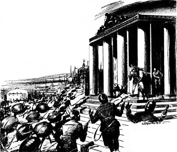 With the uprising of the people, the battle ceased to be a fight and became a massacre. The troops were selling their lives, as dearly as they could, but thousands more citizens carrying improvised weapons were pouring in from every street and the thing was only a matter of time. Then, in the rear of the panic stricken mass of nobles who were fleeing into the temple to make a last stand, while the vengeful pack bayed at their heels, Larry suddenly saw Xylon!