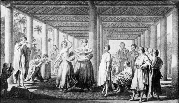 Am 12. Mai, an einem Freitag, statteten uns einige fremde Frauen von Rang einen Besuch ab. Herr Banks saß am Tore des Forts in seinem Boote neben Tootahah und andern vornehmen Eingeborenen, um die Marktgeschäfte zu erledigen. Zwischen 9 und 10 Uhr landete ein großer Kahn, unter dessen Wetterdach ein Mann und zwei Frauen saßen. Tootahah bedeutete Herrn Banks, den vornehmen Fremden entgegen zu gehen. Bis er jedoch aus dem Boote kam, waren ihm jene schon bis auf dreißig Fuß nahe gekommen. In dieser Entfernung hielten sie still und winkten ihm ein Gleiches zu tun. Hierauf legten sie ein halbes Dutzend Bäumchen und andere Pflanzen[S. 21] auf die Erde nieder. Das Volk hatte inzwischen von den Fremden bis zu Banks eine Gasse gebildet. Alsdann brachte der Mann, der ein Diener der vornehmen Frauen zu sein schien, die Bäumchen nacheinander Herrn Banks und sprach dazu einige Worte. Der Häuptling Tupia versah das Amt eines Zeremonienmeisters des Herrn Banks; er nahm die Zweige ebenso feierlich an und legte sie ins Boot. Nach dieser Feierlichkeit schleppte der Mann einen großen Ballen Tücher herbei, öffnete ihn und breitete den Inhalt stückweise zwischen Banks und seinen Gästen aus, wobei er jedesmal drei Tücher aufeinander legte. Hierauf stieg eine der beiden Frauen, die Ooratooa hieß und die vornehmere war, auf die Tücher, hob ihre Kleider ringsum bis an die Hüften auf und drehte sich mit der unschuldigsten Miene von der Welt feierlich und bedächtig dreimal im Kreise herum. Alsdann ließ sie den Vorhang fallen und trat wieder herunter. Jetzt legte man sechs Tücher und dann neun übereinander. Ooratooa wiederholte jedesmal die Zeremonie, der das Volk mit dem feierlichsten Ernste anwohnte. Danach wurde das Tuch sofort aufgerollt und Herrn Banks als Geschenk von der Dame überreicht, die mit ihrer Freundin an ihn herantrat und ihn küßte. Er machte den beiden die auserlesensten Geschenke; die beiden vornehmen Insulanerinnen blieben etwa eine Stunde, dann fuhren sie heimwärts. Am Abend bekamen die Herren im Fort den Besuch der Königin und ihrer Freundin Oteothea, eines sehr schönen jungen Mädchens.