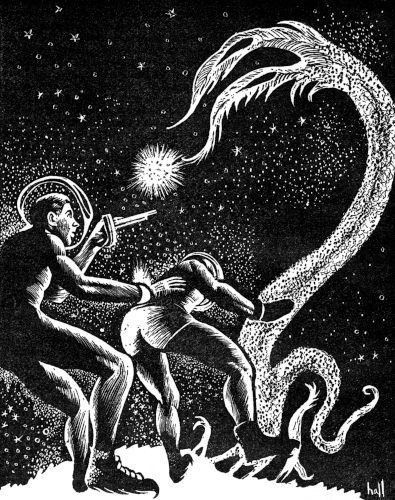 They had emerged from the locks of the ship and they were moving down the gulley. Ghor walked in his usual stiff-legged stride and clad as he was in a spacesuit, he appeared to be some sort of mechanical monster.