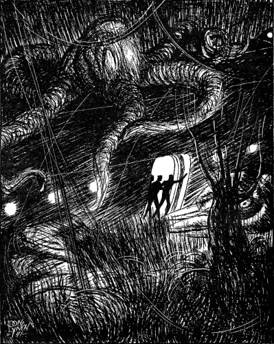 For nightmarish creatures moved within the gleaming thing, moving on stiff tentacles, gesturing with others, while above, on a thin neck, fanged mouths opened and closed in sickening motions. And the shadows of their skins were of shades of lightness and darkness that were terrifying to Klon's senses that had never met the like before.