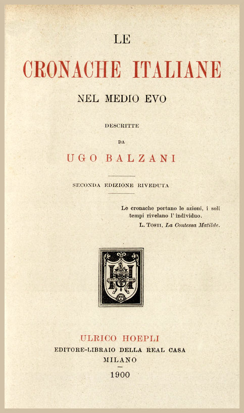 Per far meglio conoscere l'indole, la natura e lo stile delle diverse cronache, ho recato di esse nel libro molti e lunghi frammenti volgarizzati dai testi. In tal modo que' vecchi cronisti nelle ingenue pagine loro descriveranno sé stessi alla memoria e alla fantasia del lettore assai meglio che non varrebbe a descriverli l'amoroso ma incerto tentare di uno scrittore moderno. Questi frammenti erano già stati tradotti da mia moglie che ha dato veste inglese a tutto il libro e diviso con me in larghissima parte la fatica e il piacere del compilarlo. Nel voltarli ora io in italiano, [ix] ho cercato com'ella avea fatto di tenermi il più che potevo fedele alla lettera dei testi, ma, dove alcuni d'essi per la oscura e intralciata latinità si opponevano ad una traduzione letterale, mi sono sforzato d'accostarmi al concetto degli autori quanto meglio e più precisamente ho saputo farlo. Il numero dei libri dei quali mi son dovuto giovare è stato di necessità assai grande, e poiché non potevo mentovarli tutti, ho cercato almeno di professare la gratitudine mia ricordando quelli da cui ho ricavato maggior profitto. È superfluo poi l'avvertire che non essendo questo uno studio critico sulle fonti ma una storia descrittiva della nostra cronografia, ho di proposito evitato ogni discutere intorno alle sorgenti da cui ciascun cronista è venuto attingendo. Del pari non si fa discorso, o di rado e solo fuggevolmente, dei lavori che si son pubblicati e si pubblicano ad ogni ora intorno alla critica dei testi, ma ho speranza che coloro i quali hanno familiarità con siffatti lavori, non vorranno perché io ne taccio mettermi tra quelli che li ignorano e scusano il peccato della ignoranza con una sciocca mostra di dispregio. Ma costoro per fortuna ed onore degli studî nostri son rari, e la critica storica italiana, memore di sue tradizioni, cresce sempre più in fiore e dà frutti.