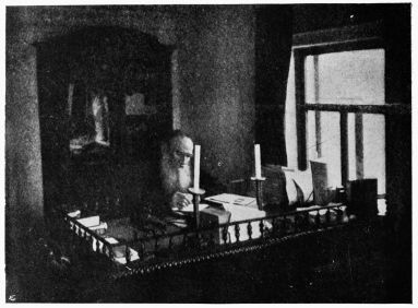 His study at Yasnaya Polyana is a small room with an uncarpeted floor, a vaulted ceiling, and thick stone walls. Formerly it was a store-room, and on the ceiling are heavy black iron rings, on which hams used to hang and which were used later for gymnastic exercises. The study is very cool and quiet, and contains various implements of labour, such as a scythe, a saw, pincers, tiles, etc.