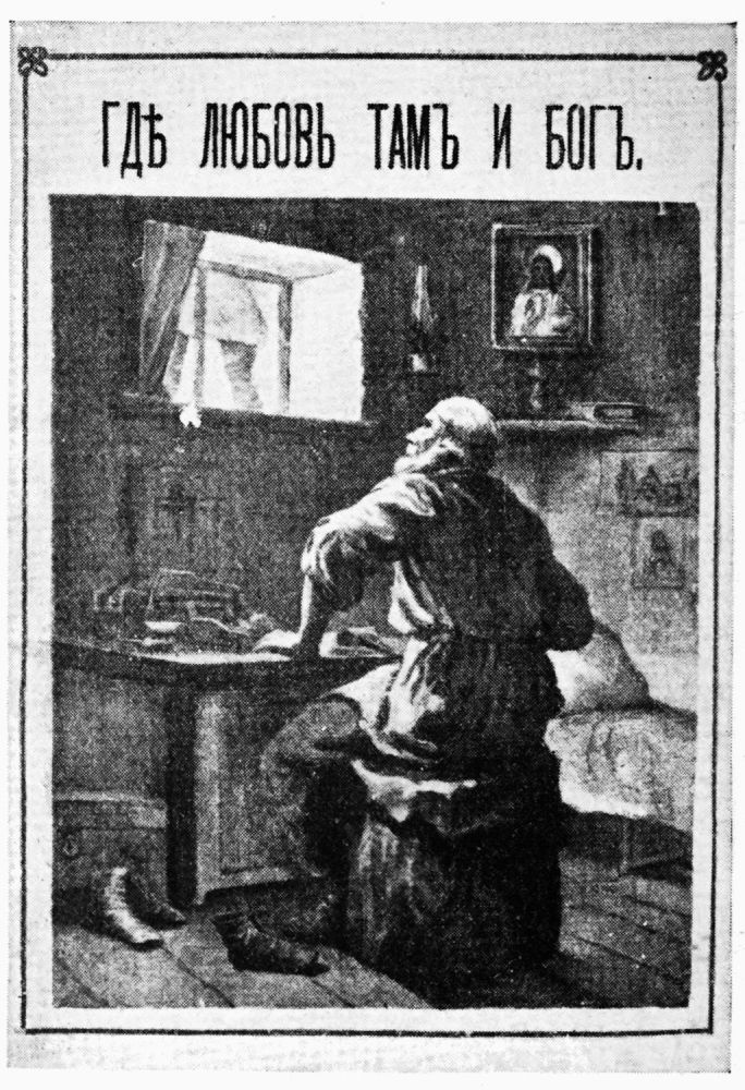 This is probably the most striking of all the portraits of Count Tolstoy, representing him when at the height of his popularity and power. In 1884 he was at work on the Popular Tales and Sketches which sold by millions throughout Russia, and from which we reproduce two or three illustrations—viz., one by H. R. Millar from the English edition of “What Men Live By,” written in 1881; another by the same artist from the English edition of “Where Love is there God is also,” and a third showing the cover of this tract, which was written in 1885, and issued in rough pamphlet form at the price of a few farthings.