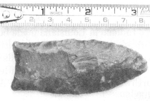 Although many people refer to all stone points as arrowheads, Indians actually made projectile points for over 10,000 years before they ever used one on an arrow. The point pictured here would have been used on a spear and could have killed a prehistoric elephant, called a mastodon.
