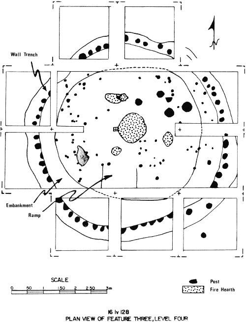 Excavation of a mound site in Iberville Parish was meticulous in order to record the relationships of materials and to collect remains for laboratory analysis (above). Archaeologists were able to determine that under the mound was a circular house built of cypress and ash poles that were covered with thatch (right). Inside were interior support posts and wooden furniture such as beds or racks, as well as a central fire hearth and four smaller fire pits. Honey locust seeds, persimmon seeds and bones from four kinds of fish indicate some of the things these prehistoric people ate. Radiocarbon dates show that the structure was being used at A. D. 1000.