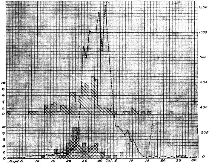 After September 23 influenza was recognized by its symptoms. The number of cases increased with great rapidity and on September 27 reached over 1,000 per day; this number was approximately maintained during one week and after October 3 the epidemic gradually subsided. Among 52,551 men in the camp, including those who arrived 17during October, 12,393 were attacked by influenza; of these 1,499 suffered with pneumonia and 466 died. The height of the outbreak of pneumonia followed approximately one week after that of influenza. The statistics from September 20 to October 14 collected by Major Freeman show that pneumonia following influenza, like the pneumonia at Camp Funston during the interepidemic period, has a conspicuous tendency to select men who have been in the camp less than one month, designated in Table I as new recruits: