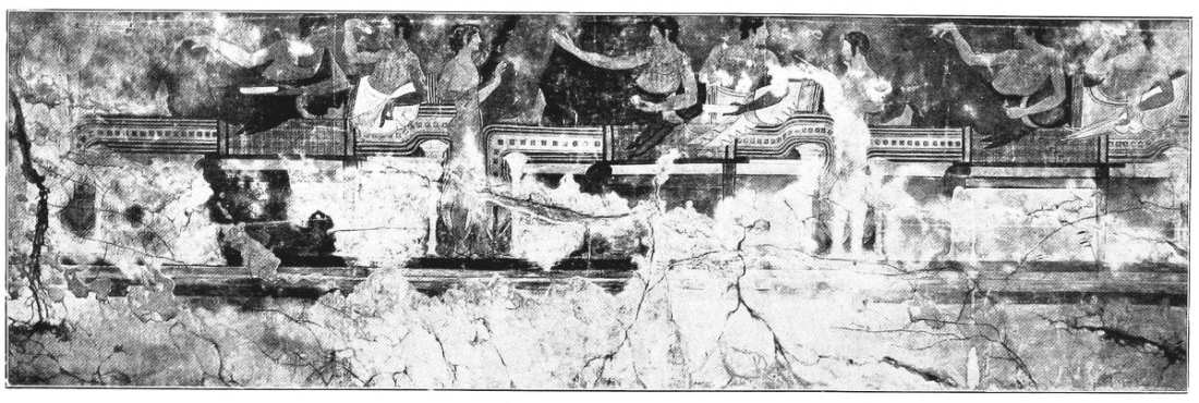 A considerable group of Etruscan tomb-paintings, dating from the middle of the sixth century, show in their composition close connexion with Ionic vase-painting, especially with the so-called Caeretan hydriae, while their main pictures tell us something about the Etruscans themselves and their conceptions of Life and Death and Eternity. Only in the animal friezes beneath the painted roof-supports does the old decorative conception of the human and animal figure still linger; elsewhere the pictures now have content and meaning.