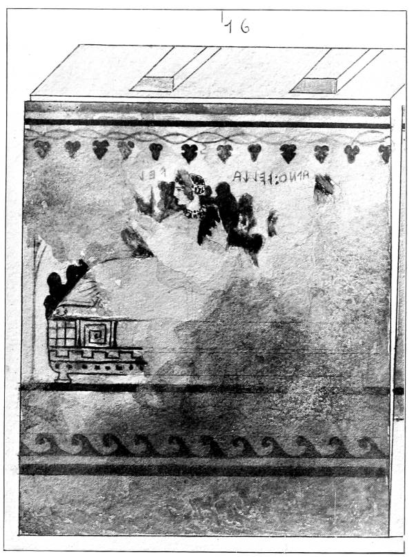 Meanwhile the first volume of the promised work of Fritz Weege (Etruskische Malerei, Halle, 1921) has appeared, copiously and splendidly illustrated. The text contains general views concerning Etruscan religion and society rather than descriptions of the paintings themselves, and I cannot refrain from saying that I find Weege’s statements and opinions, and the parallels which he adduces, too often more fanciful than convincing, in spite of the vast erudition displayed therein. I do not find anything in my own text which I feel inclined to alter after reading his book.