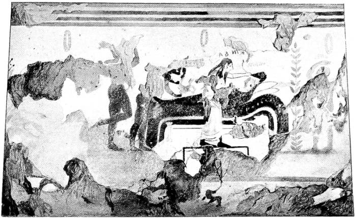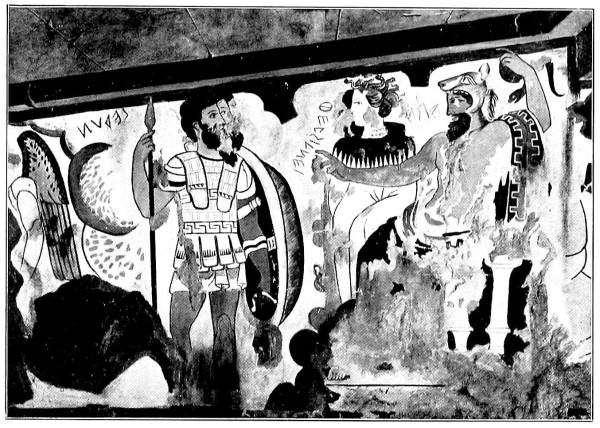 Thus in the Tomba dei Tori, besides a decorative treatment of the wall surface with friezes, we have a main picture with a mythological subject, painted in the Greek spirit and perhaps actually executed by a Greek mural painter. We do not find even the slightest allusion to death or entombment, or the least trace of any Etruscan characteristics. The inscription in the large frieze is of interest because it shows the Etruscan language in its archaic form, with a rich vocalization which must have made it much more euphonious than the language spoken later, in the fourth or following centuries. The inscription runs: ‘arnth spuriana s[uth]il hece ce fariceka,’ and means, ‘Aruns Spurinna monumentum sepulcrale ... condidit, adornavit,’ or the like.9