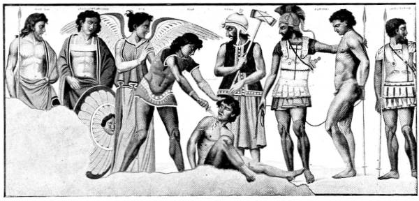 112 An Etruscan gem shows the dead Ajax and a winged genius in the act of placing the cerecloth over him. Beazley, The Lewes House Collection of Ancient Gems, p. 34., no. 37.
