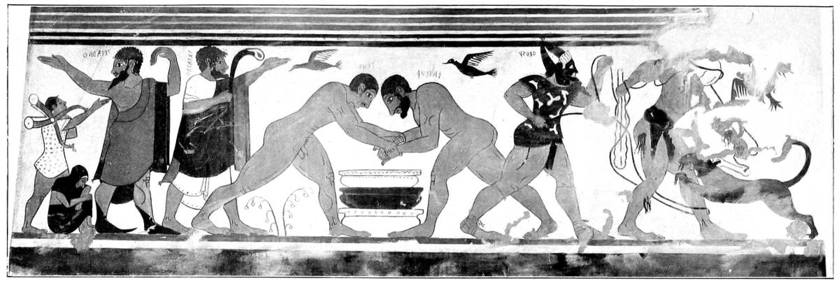 We may take the Tomba degli Auguri in Corneto, discovered in 1878, as our starting-point. There are coloured drawings as well as full-sized facsimiles of its pictures in the Helbig Museum.