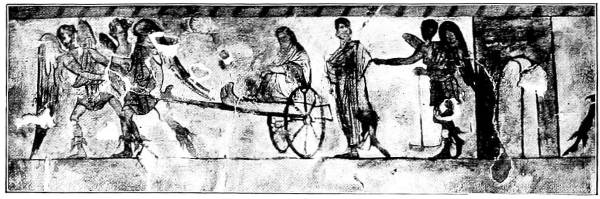 The following sketch is based upon investigations made in the Etruscan Tombs at Corneto and Chiusi, and on comparison of the original wall-paintings with the facsimiles and drawings made from them and preserved in the Helbig Museum in the Ny Carlsberg Glyptotek. It was originally published in Danish, in 1919, as a guide to students in that Department.
