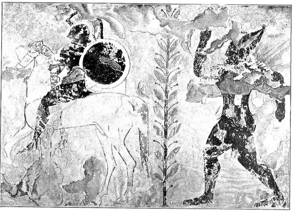 The next stage in the development is represented by the Tomba dei Tori at Corneto, discovered in 1892 and admirably published by G. Körte in Antike Denkmäler.7 The back wall of the main chamber in this tomb has two doors, and it is between these that the one large figure painting is placed, again in such a way as to suggest a tapestry stretched on the wall (fig. 2). But now the picture has a narrative content, inasmuch as a scene from the Greek cycle of myths is depicted: Achilles watches for the Trojan prince Troilus at a well. Achilles, to the left, wears a crested Corinthian helmet, sword, greaves, and red loin-cloth. Troilus is naked and only decorated with armlets and elegant shoes. He wears his hair long, according to Ionic fashion, and in his hand he carries a goad (kentron). This is, as a rule, only used when two horses are ridden, and the drawing shows traces of double contours near the head and the right leg of the horse; it is probable, therefore, that two horses were originally planned. In this picture also, the proportions of man and horse are impossible, but progress is perceptible in the monochromatic treatment of the body and legs of the horse. On the other hand, the old manner of painting in stripes or compartments is still retained in the running chimera in the pediment above; it also lingers for a very long time in the pedimental figures of the following period. The style is Ionic of the first half of the sixth century B.C. A truly Ionian monster, created under Oriental influence, is the human-faced bull in the pediment above the door, one of the two bulls from which the tomb derives its name, and which are omitted here because of the obscene groups on either side of them. Other decorative details point to Cyrene and Egypt, especially the characteristic frieze of lotuses and pomegranates, which corresponds with the Cyrenaic vases of the sixth century B.C., and the stylized flower-bed under the10 belly of the horse, which has its origin in Egyptian and its parallels in Phoenician and in orientalizing Greek art.8 In this tomb the painting is not executed al fresco but in a yellowish-white pigment which unfortunately scales off in large flakes.