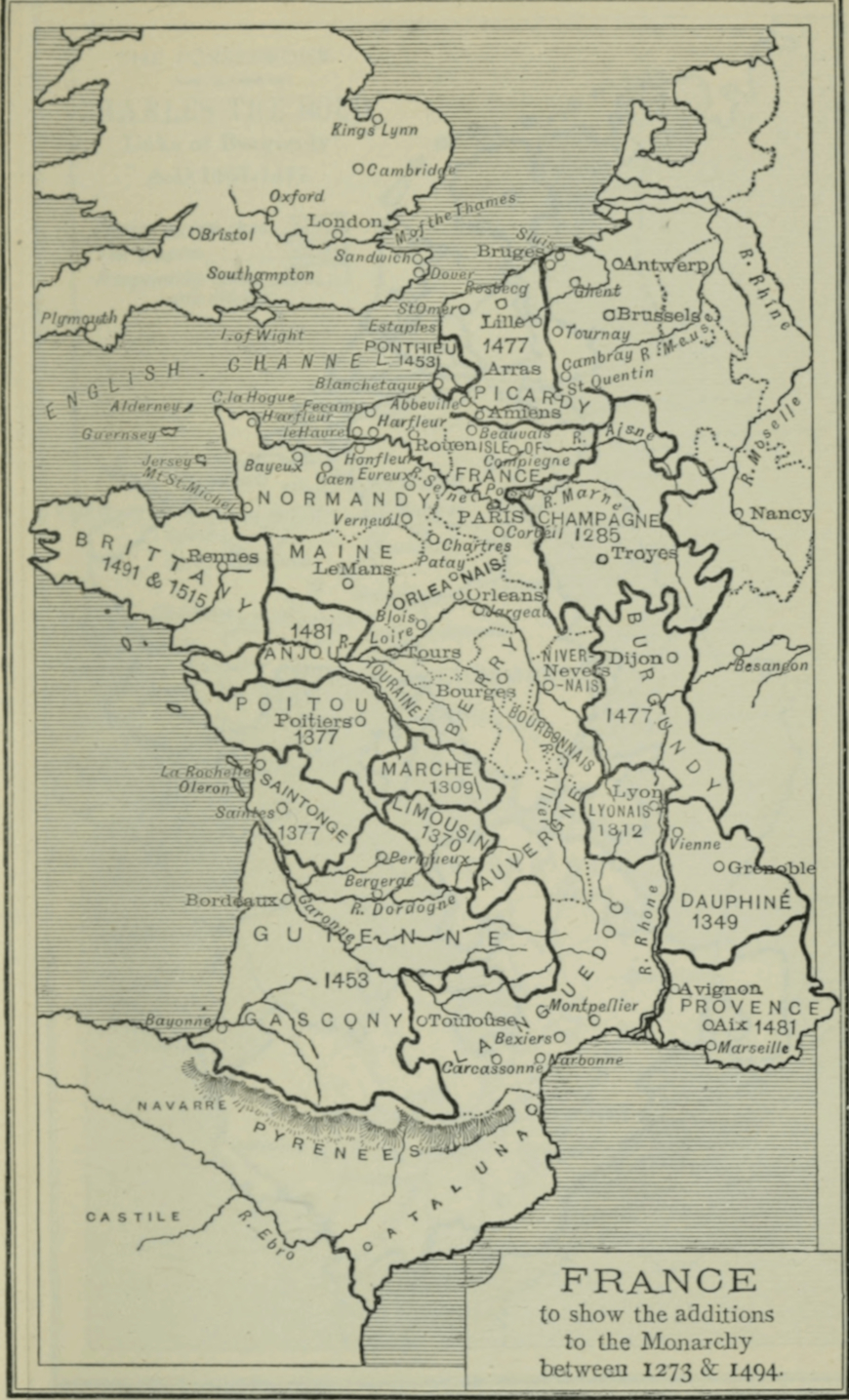 Death had at last relaxed the tenacious grip which John II. had so long maintained upon the kingdom of Navarre. Of his three children by his first wife Blanche—Charles |Navarre after 1479.| of Viana, Blanche, and Eleanor—only the last, who had married Gaston de Foix, survived her father; Charles had been poisoned by his father, and Blanche had been poisoned by her sister. And, after all, Eleanor only outlived her father for a few weeks. Her grandson, Francis Phœbus, succeeded her, but died in 1483, and his sister Catharine carried the kingdom to the house of d’Albret. From this family Ferdinand the Catholic wrested that part of Navarre which lay on the Spanish side of the Pyrenees. The remainder came to the house of Bourbon by the marriage of duke Antony to Jeanne d’Albret, and by the accession of their son Henry IV. to the throne was ultimately annexed to France. When in the following century Roussillon and Cerdagne were finally handed over to the same state (1659), the Pyrenees at last became, as nature seemed to have intended, although history was always thwarting her intention, a boundary between two separate states.