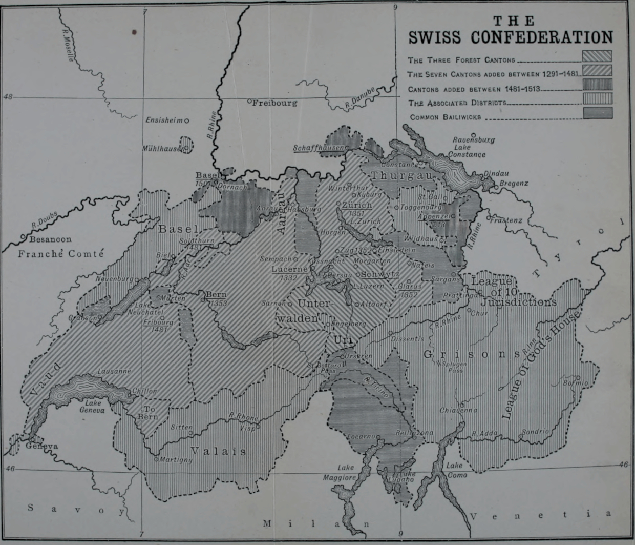 Note.—The Hapsburg territories were divided between Albert III. and his brother Leopold, the former taking Austria, and the latter all the rest. Of the sons of Leopold, Ernest succeeded to Styria and Carinthia, Frederick to Tyrol and the lands in Swabia. The Albertine line became extinct with the death of Ladislas Postumus, when Austria passed to Frederick III., and the latter’s son, Maximilian I., reunited all the territories of the house.